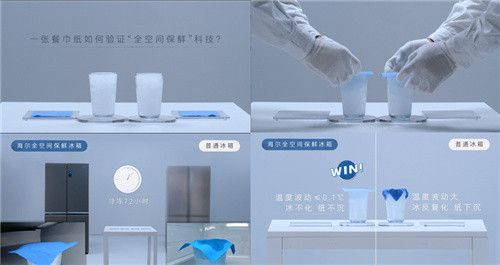 視頻中,實驗人員將餐巾紙放在兩杯相同的冰上,并分別放入海爾全空間保鮮冰箱和普通冰箱中。經(jīng)過72小時的冷凍,從海爾全空間保鮮冰箱中拿出的餐巾紙依舊平整如初;而普通冰箱里的餐巾紙已被浸濕,覆蓋在杯口的部分明顯下沉。