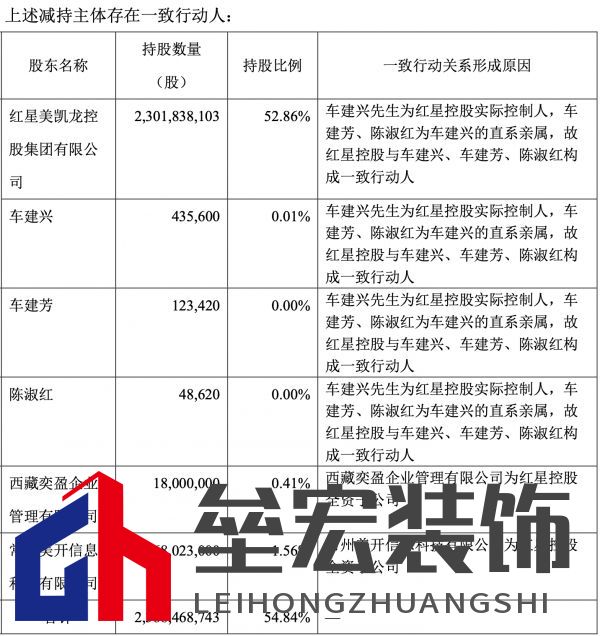 ??截至公告披露之日,紅星美凱龍家居集團(tuán)股份有限公司(以下簡(jiǎn)稱“公司”)控股股東紅星美凱龍控股集團(tuán)有限公司(以下簡(jiǎn)稱“紅星控股”)持有公司2,301,838,103股,約占公司總股本的52.86%,紅星控股及其一致行動(dòng)人合計(jì)持有公司2,388,468,743股股份(全部為無(wú)限售條件流通股),約占公司總股本的54.85%。 |