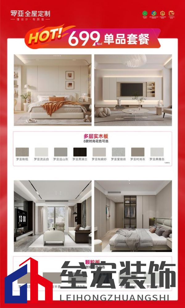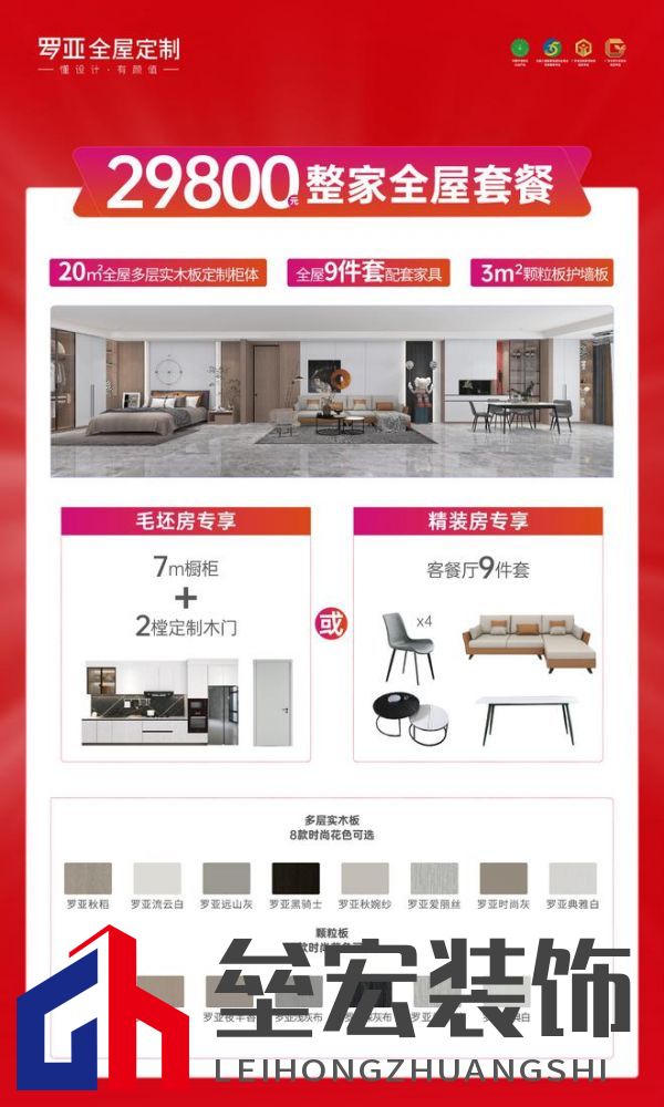 29800元整家全屋套餐,毛坯/精裝一口價配齊 相比于市場上同類套餐,購買羅亞全屋定制柜/護(hù)墻板/定制木門,實現(xiàn)流行的柜墻門一體化設(shè)計,僅需29800元一價配齊,極具“質(zhì)價比+心價比”優(yōu)勢;同時,柜墻門一體化搭配,無需操勞奔波建材市場每家比較,也不用擔(dān)心花色、風(fēng)格、售后服務(wù)沖突等一系列煩事,省時又省心。此外,該套餐分別針對毛坯房和精裝房,配置了不同的套餐內(nèi)容。 29800元整家全屋套餐=20㎡全屋多層實木板定制柜體+3㎡顆粒板護(hù)墻板+7m櫥柜+2樘定制木門(毛坯房專享)或20㎡全屋多層實木板定制柜體+3㎡顆粒板護(hù)墻板+客餐廳9件套(精裝房專享),一個套餐就能將柜、墻、門等產(chǎn)品一站配齊,真正實現(xiàn)“一家搞定,一價配齊,一體設(shè)計”。