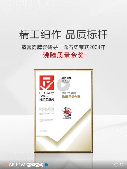 ??本年度測(cè)評(píng)中,近500款產(chǎn)品競(jìng)相角逐。箭牌瓷磚參評(píng)的尋·逸石集以卓越性能與優(yōu)異品質(zhì)脫穎而出,榮獲2024年度“沸騰質(zhì)量金獎(jiǎng)”,在行業(yè)內(nèi)引發(fā)廣泛關(guān)注。