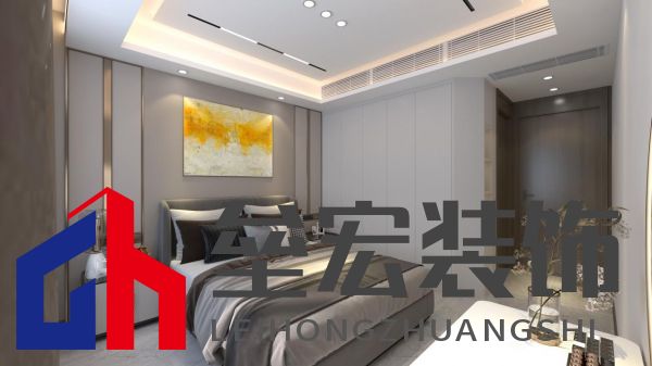 ??主臥室床頭為墻板背景墻,鈦金條點綴,莊重典雅,頂面為無主燈懸浮吊頂,既可以滿足中央空調(diào)的安裝,中間也不顯空曠。