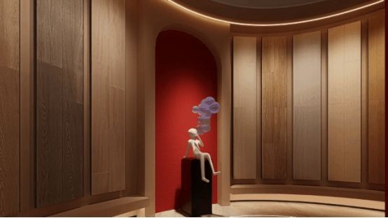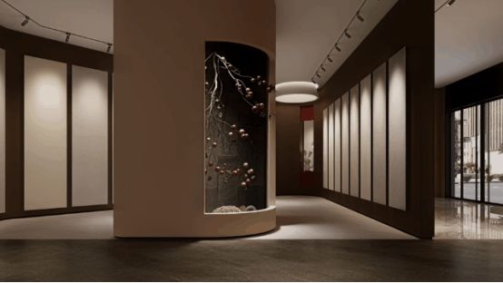 弧形選材區(qū)以立柱為中心,采用發(fā)散式弧形布局打破傳統(tǒng)展示邊界。鏡面天花與流暢的展線設(shè)計形成視覺延伸,讓空間在虛實交錯中倍增開闊感。
