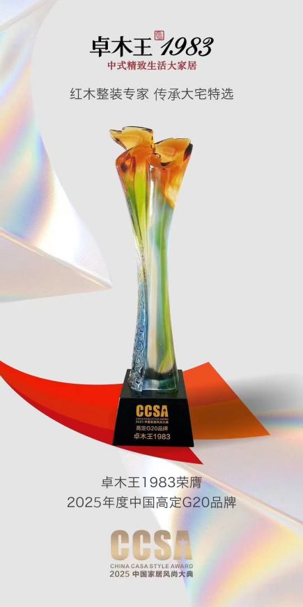 2025年7月8日,在萬眾矚目的“萬福倉之夜——致敬高定十年·第十屆CCSA家居風(fēng)尚大典暨2025高定十年G20+頒獎禮”上,紅木整裝創(chuàng)lin品牌卓木王再度榮膺“高定G20品牌大獎”。 作為“紅木整裝世家 傳承祖宅首選”品牌,卓木王已連續(xù)幾年蟬聯(lián)此項(xiàng)行業(yè)頂ji榮譽(yù),卓木王持續(xù)獲得行業(yè)高度認(rèn)可,穩(wěn)居中式高定標(biāo)桿地位。