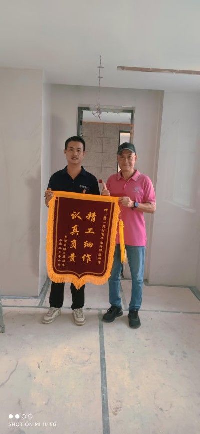 ??盛夏的工地沒有空調(diào),汗水順著額角淌進(jìn)眼睛里,他抹把臉繼續(xù)校準(zhǔn)瓷磚,手指不停在磚邊比畫,就怕一刀下去破壞了紋路的流暢;寒冬的風(fēng)裹著冷氣往骨頭里鉆,指尖凍得發(fā)僵,他就往手心哈口熱氣搓搓,再繼續(xù)貼著磚邊找角度,哪怕膝蓋抵著冰冷的地面麻了半邊腿,也得等確認(rèn)切口和原磚嚴(yán)絲合縫才肯起身。 ??這些藏在寒暑里的堅(jiān)持,讓他通過手里的磚片,把“切磚如原磚”的細(xì)致,刻進(jìn)了深圳深鐵懿府、臨海攬山、香蜜湖熙園這些深圳高端住宅的角落里。而這樣的細(xì)致,陪著他鋪妥了300多個(gè)家的瓷磚,從未打折扣。 ??簡(jiǎn)一5A空間交付:只為那份妥帖和心安 ??有人問他:“干這么多年,哪一刻最有成就感?”陳偉超笑了:“前陣子在香蜜湖別墅,業(yè)主看完非常滿意,當(dāng)場(chǎng)說‘這項(xiàng)目的其他地方也給你們做’。” ??這份信任,源于他對(duì)工藝精度的執(zhí)著打磨,簡(jiǎn)一今年全新升級(jí)「5A精工薄貼」工藝后,他貼的磚縫能控制在0.2毫米以內(nèi)——比半根頭發(fā)絲還細(xì),站在遠(yuǎn)處看,墻/地面像一整塊渾然天成的石材,紋理順著墻/地面自然延伸,業(yè)主驗(yàn)收時(shí)湊近了才發(fā)現(xiàn)“原來有縫”。 ??這一面面由業(yè)主親手送上的錦旗,便是對(duì)陳偉超匠心最生動(dòng)的認(rèn)證:深圳星河丹堤李小姐送來的“手藝精湛 完美呈現(xiàn) 服務(wù)周到 盡心盡責(zé)”,16個(gè)金光大字里,仿佛能看見他為調(diào)順一道紋理,蹲在地上半天不動(dòng)直到腿麻的執(zhí)著,也能想起他一次次停下手中活計(jì),耐心解答業(yè)主疑問時(shí)眼里的真誠(chéng);