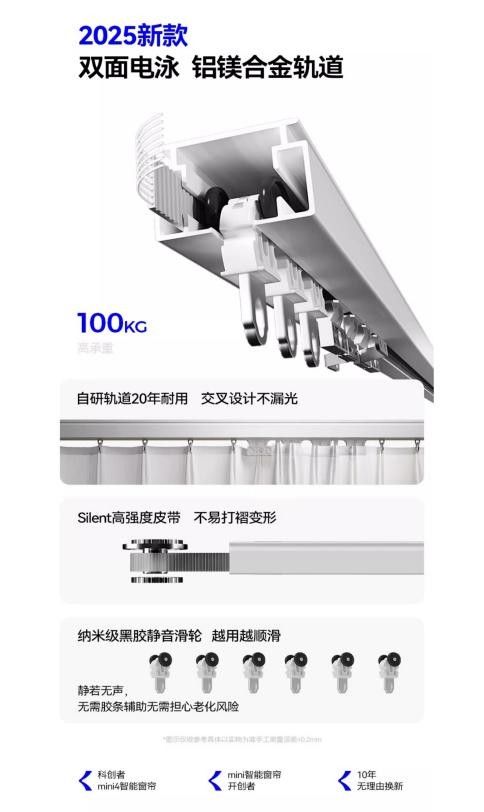 此外,定制軌道通過一系列優(yōu)質(zhì)配件,實現(xiàn)手拉順滑;定制的軌道厚度及配件,保證了長壽命和耐用性;靜音電機和定制軌道及配件配合,達(dá)到超靜音效果;更有電機10年無理由換新的優(yōu)質(zhì)服務(wù),讓用戶省心無憂,如同為用戶的窗簾生活上了一份長期保險。